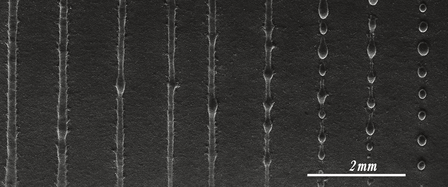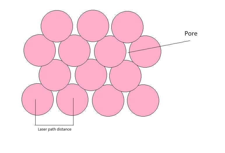 - Beading-ilmiö (balling): Alhaisella laserteholla ja riittävän suurilla skannausnopeuksilla sulareitti hajoaa pisaroiksi, jolloin muodostuu satunnaisia aukkoja.